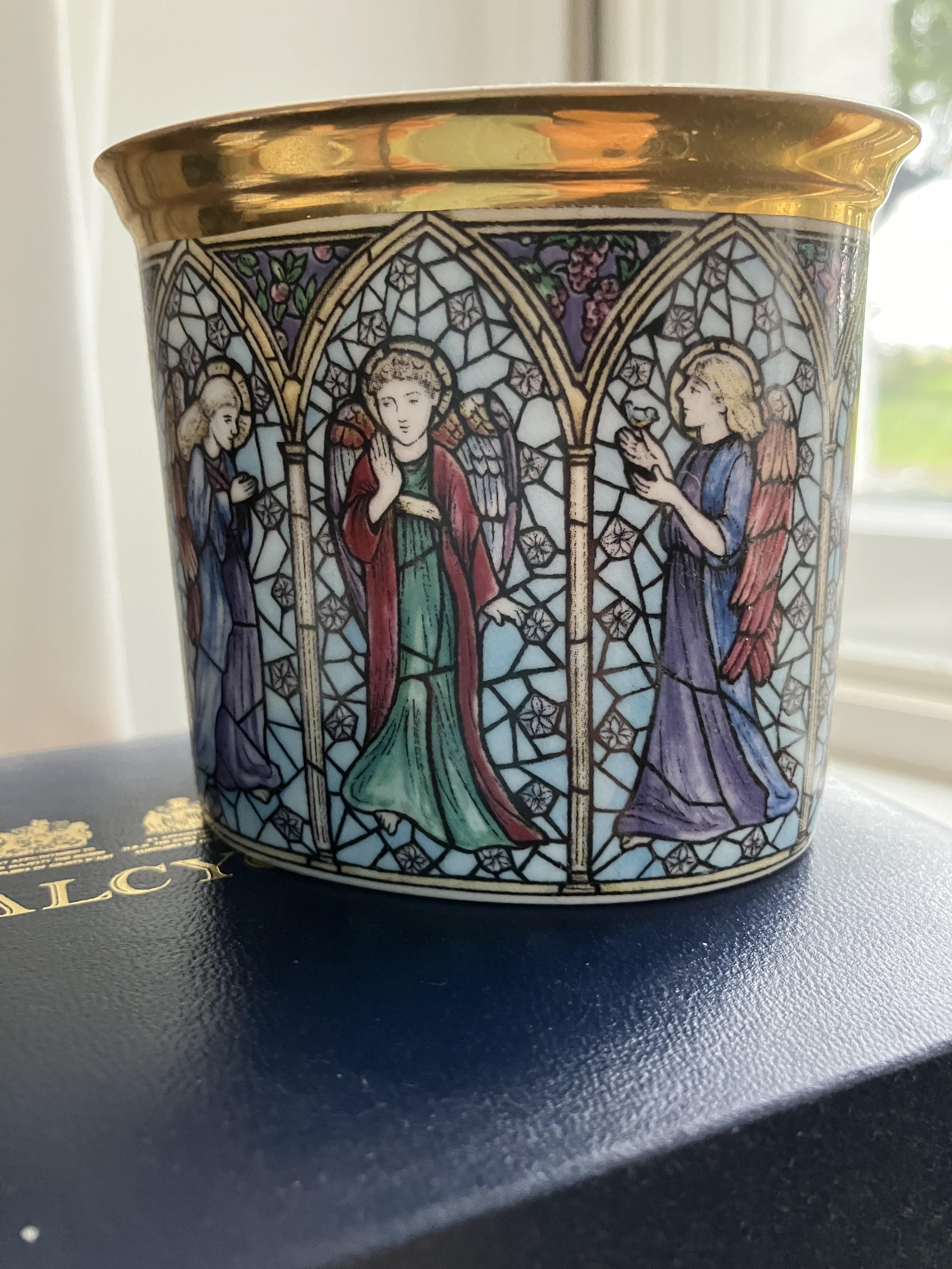 Angel Candle design in porcelain - painted by me in watercolours on the original flat artwork. Inspired by the stained glass windows created by Sir Edward Burne-Jones. Glows beautifully with a candle inside.